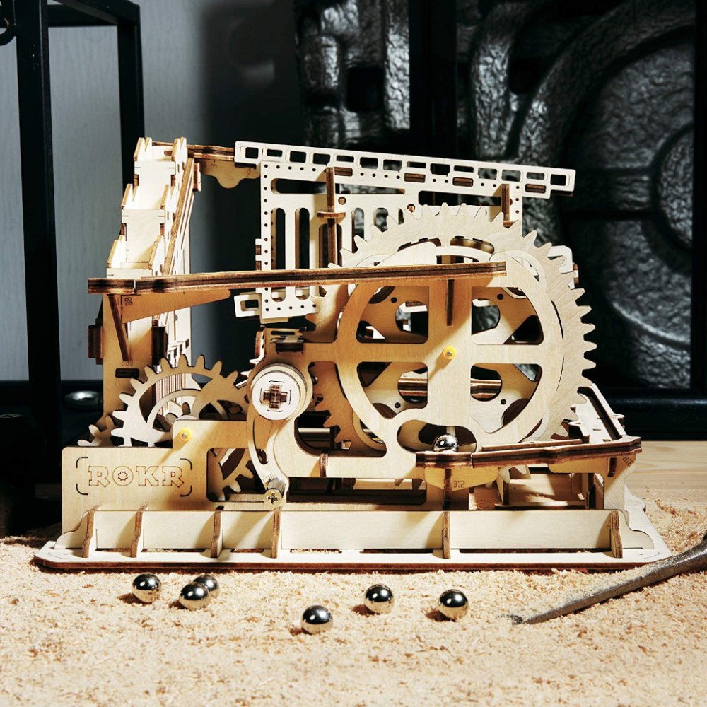 Golyópálya lépcsős lifttel és süllyesztők sorozatával. A Robotime golyópálya-készletei máshol nem látott részleteket és változatosságot kínálnak. Mindegyik eredeti funkcionális részletekkel és változatos akadályokkal büszkélkedhet, amelyek gyakran ötletesen megváltoztatják a golyó útját, és ezzel kivételes szórakozást nyújtanak. A mechanizmust kézi hajtás, a fogantyú forgatása hajtja, amellyel a golyókat is felemelik és rendszeresen elindítják az úton. A készlet szétszerelt állapotban, dobozba csomagolva kerül forgalomba. Részletes összeszerelési útmutatóval ellátva. Főbb jellemzők:pályakészlet és 10 golyó233 precízen kivágott alkatrészközepes összeszerelési nehézség