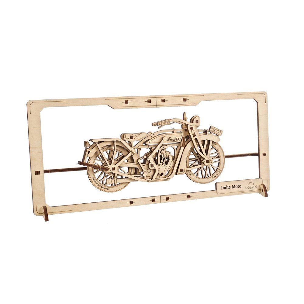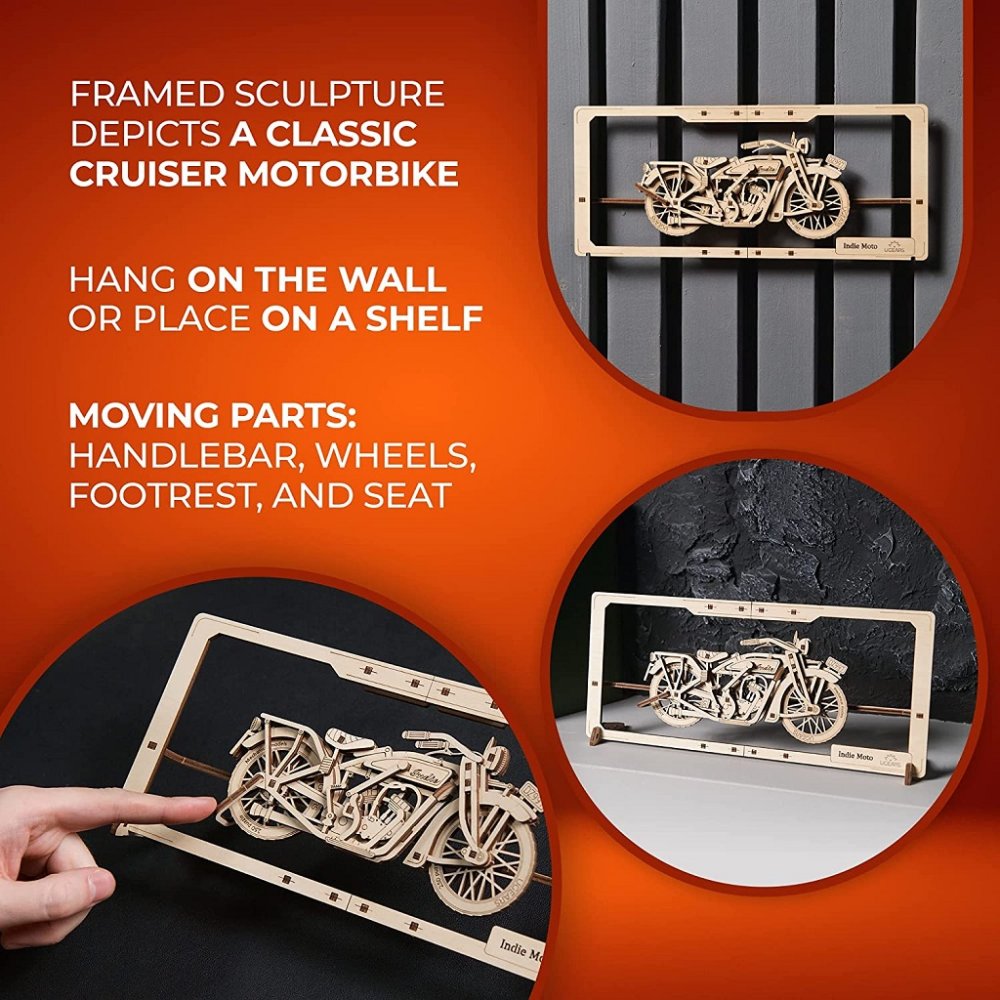 Ez az Indie Moto motorkerékpár modellkészlet a mechanikus 2.5D Classic Vehicles építőkészletek új sorozatának első darabja, felnőttek és gyerekek számára egyaránt. Az Indie Moto egy klasszikus stílusú cruiser motorkerékpárt ábrázol, amely a retro Indian motorkerékpárokhoz hasonlít. Ennek a motorkerékpár modellnek mozgatható elemei vannak, így elforgathatja a kormányt, elforgathatja a kerekeket, leengedheti a lábtartót és beállíthatja az ülést, miközben a motorkerékpár kecsesen ül a fa keretben. A csomag tartalmaz egy képállványt és egy részletes, illusztrált utasításokkal ellátott útmutatót. Az építőkészlet összeszereléséhez nincs szükség szerszámokra vagy ragasztóra. A modell alkalmas kezdőknek, és az összeszerelés körülbelül 30 percet vesz igénybe. Egyszerűen nyomja ki a lézerrel előre kivágott darabokat a fa deszkákból, és pattintsa össze őket, hogy elkészítse a teljes képet. A kész modell a falra akasztható, vagy díszítheti vele az íróasztalt vagy a polcot. Nagyszerű ajándék barátoknak és családtagoknak, akik szeretik a motorkerékpárokat, a gyors gépeket, a modellkészítést vagy a mechanikus építőkészleteket. Vagy azoknak, akik szeretnék feldíszíteni a belső terüket. Főbb jellemzők: fejleszti a finommotoros készségeket, a türelmet és a térbeli képzelőerőtminőségi anyag és kidolgozásalkatrészek száma 42összeszerelési idő kb. 0,5 óranehézségi szint: egyszerűaz összeszerelési útmutató a csomag részeUkrajnában tervezték és gyártották
