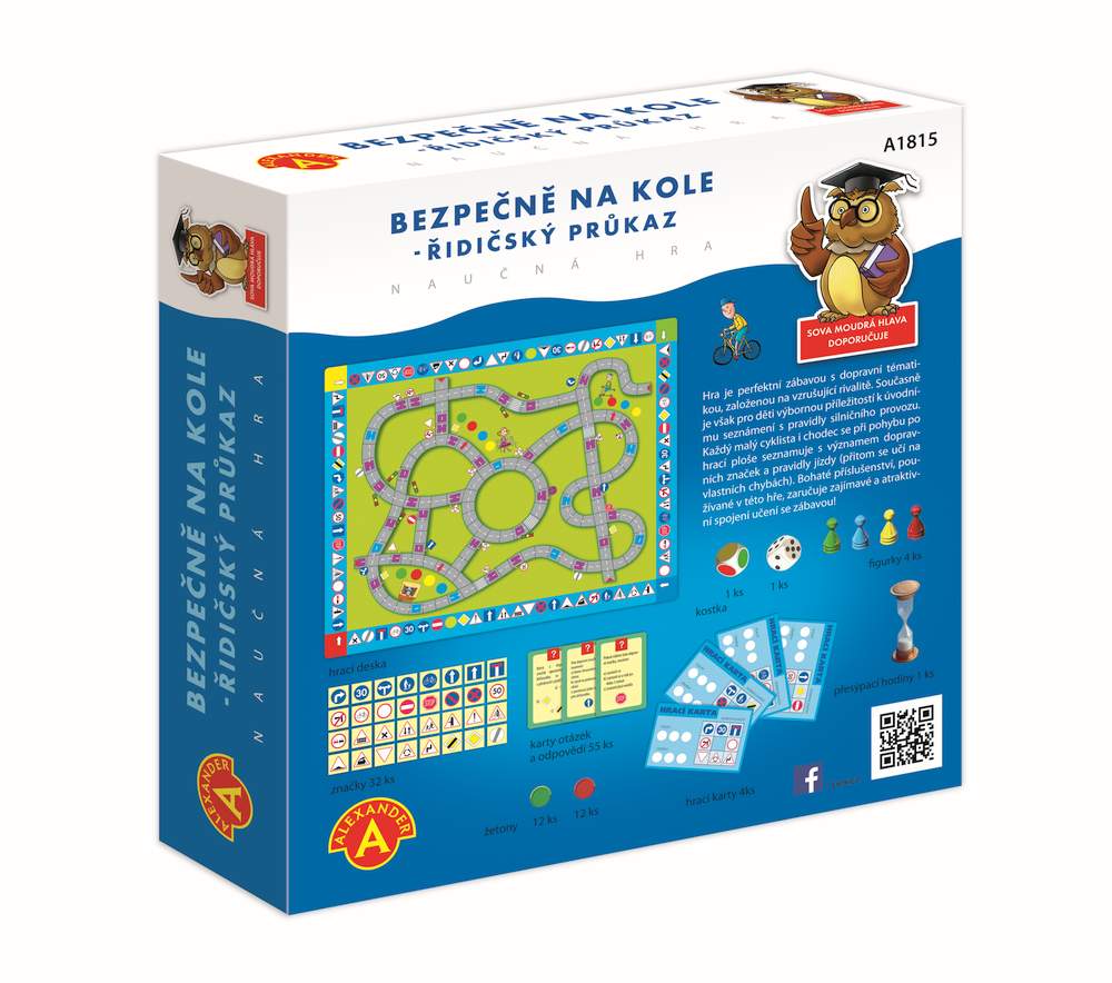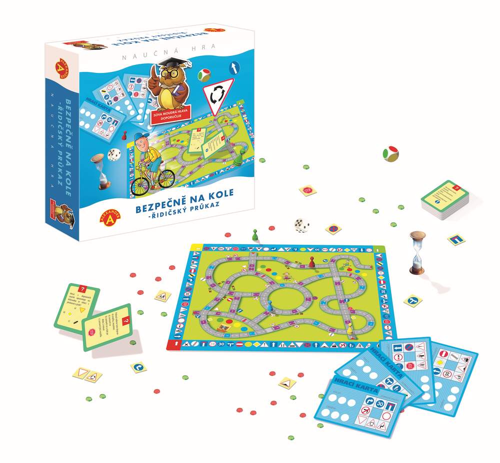 A 2018-as ÉV JÁTÉKA díj nyertese a Cseh Köztársaságban – 3. helyezés. Nélkülözhetetlen játék minden kis kerékpáros számára. Kiváló alkalom a 7 év feletti gyermekek számára, hogy megismerkedjenek a szabályokkal, mielőtt belevágnak a valódi közúti forgalomba. A felnőttek átismételhetik, mit kell tudniuk a közlekedésről, és gyakran azt is megállapítják, hogy nem mindig viselkednek helyesen!  Gyűjtsön bírságokat vagy jutalmakat, és tanulja meg a szabályokat. Tudja, mikor közlekedhet a járdán, és mikor erősebb a kerékpár, mint egy kamion? Minden játékos a játéktáblán való mozgás közben megismeri a közlekedési táblák jelentését és a közlekedési szabályokat (miközben saját hibáiból tanul). A játékban használt gazdag tartozékok érdekes és vonzó kombinációját garantálják a szórakozással való tanulásnak! A játék ismételt lejátszása biztosítja a közúti közlekedéssel kapcsolatos ismeretek javítását és a kis kerékpárosok biztonságának növelését a közúti forgalomban.  A játék elve: I. szakaszAz I. szakaszban minden játékosnak 8 különböző közlekedési táblát kell szereznie (a kiosztott Játékkártya szerint). A 8 közlekedési tábla összegyűjtéséhez ismerni kell a közlekedési táblákat. A játék a tábla körül elhelyezett mezőkből (közlekedési táblákból) álló külső pályán kezdődik. A játékos mindig dob a játék- és a színes kockával, és az óramutató járásával megegyező irányban elmozdítja a figuráját. A színes kocka növeli a játékos mozgási lehetőségeit, és ezáltal a szükséges jelek gyorsabb megszerzésének esélyét is. Ha a játékos megáll egy táblával ellátott mezőn, meg kell mondania, hogy melyik táblacsoportba tartozik (pl. figyelmeztető táblák), és mit jelent (pl. ,,Kereszteződés´´) Ha a válasz helytelen, a játékos nem kap semmit, és a következő játékos következik. Ha a válasz helyes, a játékos ugyanazt a jelzést kapja a dobozból, amelyet a játéklapjára tesz. Miután a játékos megszerezte az összes jelzést, amely a kártyáján szerepel, befejezi az I. szakaszt, és arról a mezőről, ahol az utolsó, nyolcadik jelzést ,,szerezte´´, átlép a játékos jobb oldala felé legközelebb eső szürke mezőre, piros háromszöggel, amely a II. szakasz útvonalát kezdi meg.  II. szakasz: A játék II. szakaszában a résztvevők megismerkednek a közlekedési szabályokkal, és elsajátítják a közlekedési táblák jelentését. Fontos, hogy mindig a közlekedési jelzéseknek megfelelően haladjunk. A játékos számára a kötelező jelzések az út jobb oldalán és a haladási irányában találhatók. Az a játékos, aki a II. szakaszban a szabályokkal ellentétesen halad, és egy másik játékos ,,tetten éri´´, ,,BÜNTETÉST´´ kap. Mindenkinek úgy kell megválasztania az útvonalat, hogy a lehető leggyorsabban kiszállítson 3 jutalmat, amelyek a játékkártyáján vannak minden barátjának, de legalább 3 Kérdés és válasz kártyát is be kell szereznie. Az a játékos nyer, aki elsőnek gyűjt össze (bármilyen sorrendben) 3 Kérdés és Válasz kártyát, és helyezi el a táblán mind a 3 jutalmat.  A csomag tartalma:  játéktábla 1 dbszínes figurák 4 dbközlekedési jelzés zsetonok 32 dbjáték kártyák értékelése 4 dbKérdések és válaszok kártyák 55 dbjáték kocka 1 dbszínes kocka 1 dbhomokóra 1 dbbüntetések 12 db piros zsetonjutalmak 12 db zöld zsetoncseh játékszabály 1 db  Főbb jellemzők: iskolai oktatásra is alkalmas  a szabályok tanulása balesetveszély nélkül a gyerekek a saját hibáikból tanulnak a leggyorsabban a játék a jelenleg érvényes közlekedési szabályokat használja