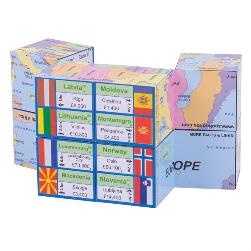 A didaktikai kocka minden irányban és sokféle kombinációban összerakható. A kockán lévő feliratok angol nyelvűek. A gyerekek minden kombinációban hasznos információkat találnak az egyes európai országokról. Érdekességeket tudhatnak meg arról, hogy melyik ország a legnépesebb és melyik a legjobban kereső. Szórakoztató módon tanulják meg felismerni a fővárosokat és a zászlókat. A térkép a kocka felületén van elhelyezve, és interaktívan összerakható. Kiválóan használható iskolákban, otthon és utazás közben is. Megfelel a jelenlegi biztonsági előírásoknak. Főbb jellemzők: tények és számok a fővárosokról, a népességről, a nyelvekről és egyebekrőlszórakoztató és érdekes földrajztanulás