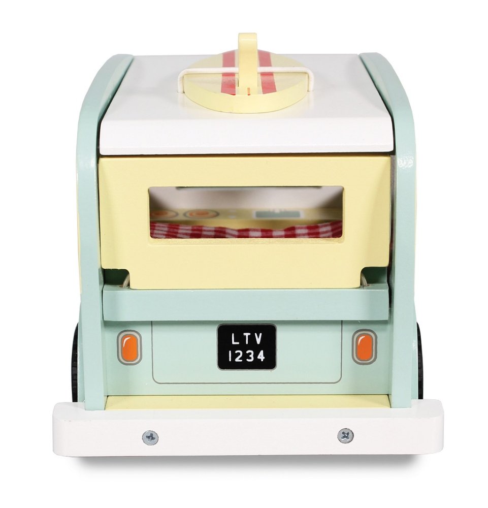 A vintage lakókocsi elviszi Önt kirándulásra és nyaralásra is! A képzeletbeli játéknak nincsenek korlátai, az autós lakókocsi így elindulhat szörfözésre vagy kerékpáros kirándulásra, európai útra… Pasztell menta, krém és fehér színekkel van festve. Levehető teteje van, belül pedig matrac, szörfdeszka és sok festett részlet is található. 10 cm-es figurákhoz alkalmas, ezek nem tartoznak a csomaghoz.  Játékok céllalA Le Toy Van cég összes játéka azzal a céllal készül, hogy sokáig kitartson. Szeretettel tervezték tapasztalt kézművesek etikus gyakorlatok és fenntartható anyagok felhasználásával, amelyek kíméletesebbek bolygónkhoz. Főbb jellemzők: etikusan, fenntartható fából készülta legszigorúbb szabványok szerint tesztelvevízbázisú, nem toxikus festékekkel festvea képzeletbeli játékra ösztönözfejleszti a kognitív készségeket  Daisylane kollekció: A Le Toy Van cég babaházainak és kiegészítőinek rangos kollekciója. Több mint 25 évvel ezelőtt Georges alapító megtervezte az első babaházát, a cég építőkövét. Etikusan, fenntartható anyagokból készült, a Daisylane fából készült babaházak egyedülállóak, és nem fogják vissza a gyermekek fantáziáját. Családi örökség, igazi befektetés a játékba.