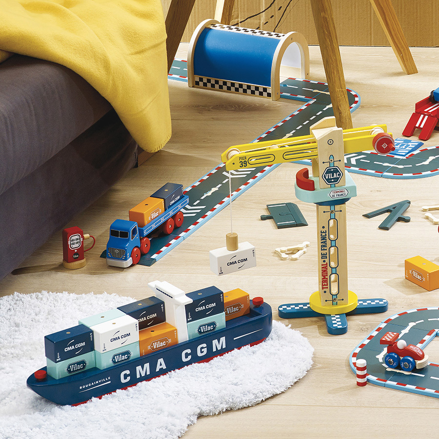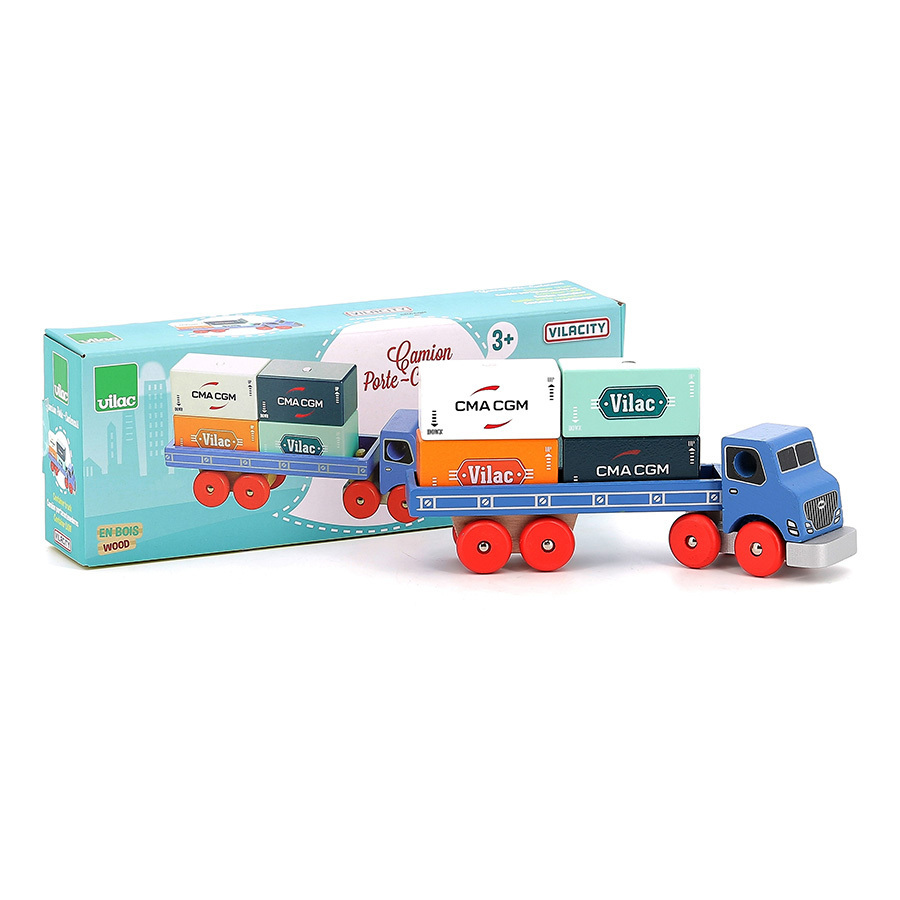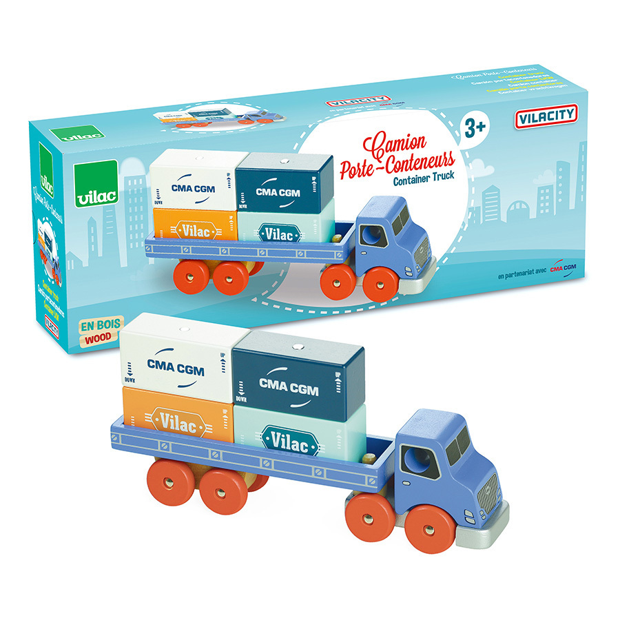 Fából készült vontató mágnesesen összekapcsolt konténerekkel, a vezető francia szállítmányozó társasággal, a CMA CGM-mel együttműködésben gyártva. A Vilacity kollekció része, és teljes mértékben kompatibilis annak minden alkatrészével, a további különálló bővítések változatosságot hoznak és elmélyítik a játékélményt.   Főbb jellemzők:vontató, pótkocsi és 4 konténermágneses kötésekkompatibilis a Vilac Vilacity kollekció összes elemévelkörnyezetbarát módon készült   V2357 – Vilacity kikötői daru (nem tartozéka a készletnek, megtalálható kínálatunkban):      V2356 – Vilacity teherhajó (nem része a készletnek, kínálatunkban megtalálható):      V2356S – Jacques Saadé Vilacity teherhajó (nem része a készletnek, kínálatunkban megtalálható):      Példa egy teherautó összeállítására a Vilacity kollekció más alkatrészeivel: