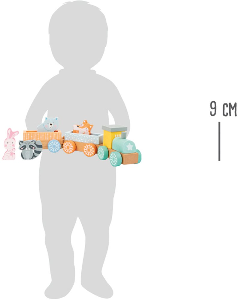 Tü-tüü, megérkezik a vonat! Ez a pasztellszínű kisvonat vidám utasokat szállít. A két vagont egyszerűen összekapcsolhatja. A kis mozdony egy alvázból és két felhelyezhető kockából áll. A csomagban egy színes róka, nyúl, mosómedve és medve is található, akik már várják a vonat indulását. Főbb jellemzők: 1 mozdony, 2 vagonállatfigurákpasztellszínű fa játék
