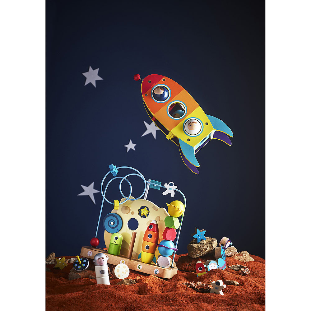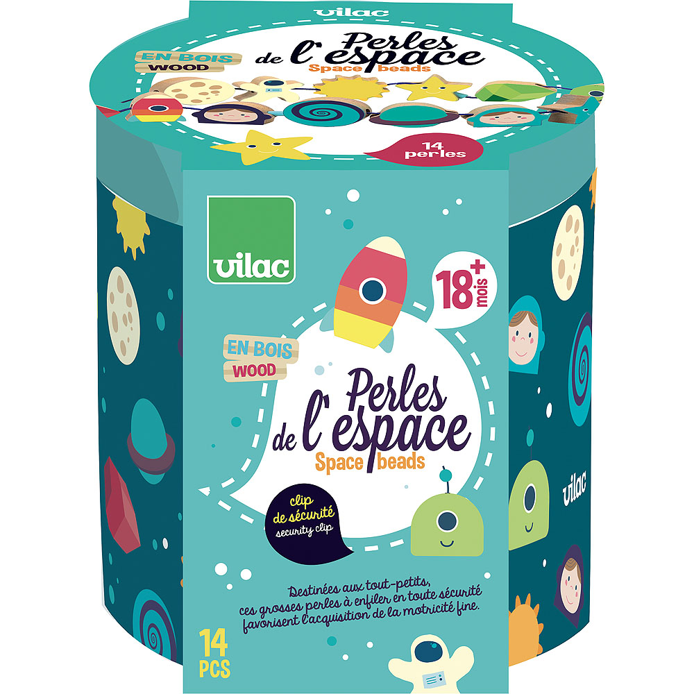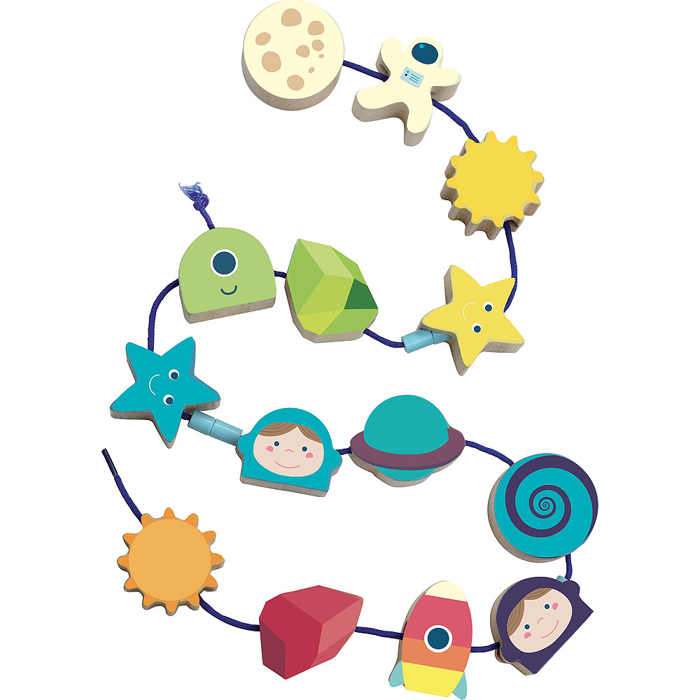 Gyönyörű fűzögető űrmotívummal. A kompakt csomagban 14 illusztrált fa gyöngyöt találsz (pl. űrhajós, hold, nap, rakéta), amelyeket a gyerekek egy textil zsinórra fűzhetnek. A játék segíti a finommotorika fejlesztését. Biztonsági kapcsokkal felszerelve. 18 hónapos kortól alkalmas.  Főbb jellemzők: 14 felfűzhető formakörnyezetbarát módon készült, kímélve a környezetet