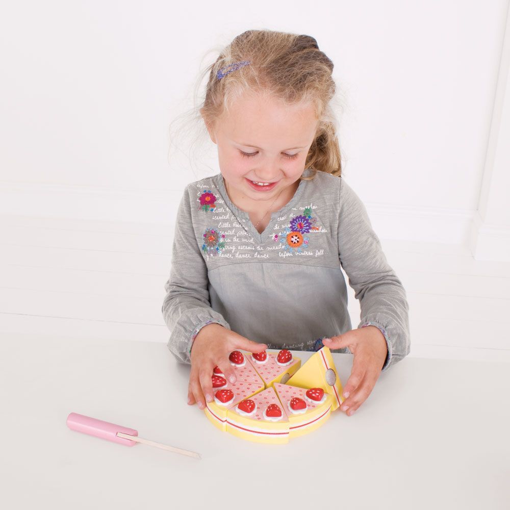 Ez a fa, epres-piskótás torta szinte igazinak tűnik. A gyerekek örömmel szolgálhatják fel barátaiknak és családjuknak. A hat színes szeletből álló tortát egy fa szeletelővel oszthatod fel – ideális kiegészítője konyhai és élelmiszerkészleteinknek. A csomag tartalmazza a tortát és a kést (alátét nélkül). Főbb jellemzők: fából készültAz egyes darabokat tépőzár tartja össze
