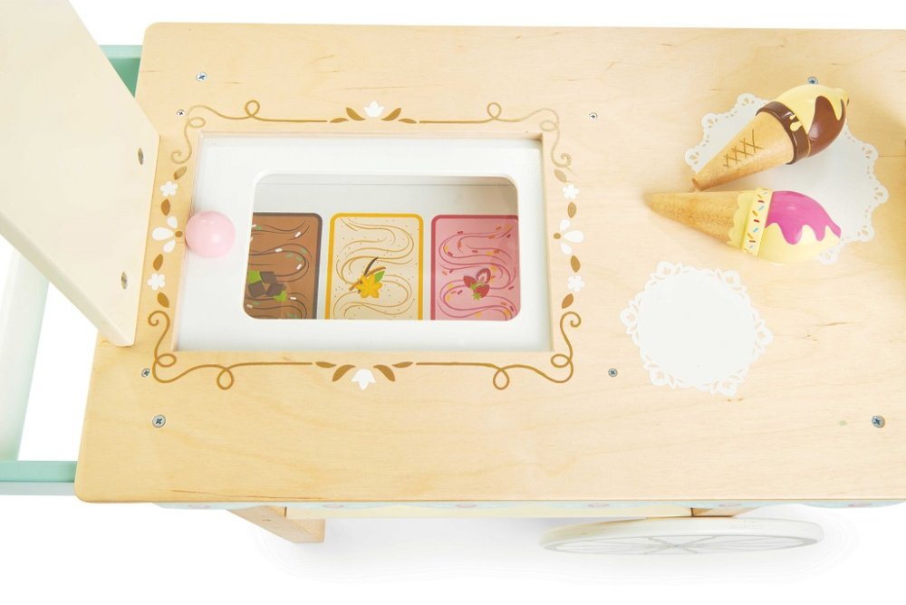 Nyári frissítő! A stílusos fagylaltoskocsival, amelyet manapság ritkán látni, a gyerekek fagylaltárusnak képzelhetik magukat. A retro fagylaltoskocsi tökéletes a fantáziadús játékhoz a gyerekszobában és a kertben is. Klasszikus csíkos vászon baldachin, pasztell színek és arany részletek, ez a valóban egyedi játék fenntartható fából készült, és úgy tervezték, hogy sok éven át tartó fantáziadús játékot kibírjon. Számos valósághű funkcióval rendelkezik, amelyeket a gyerekek játék közben fedezhetnek fel. Jégrekesz tolóajtókkal, amelyek felfedik a klasszikus fagylaltízek illusztrációit, két mágneses fagylalttölcsér, mozgatható kerekek, amelyeknek köszönhetően bárhol felszolgálhatják a fagylaltot. Játékok céllalA Le Toy Van cég összes játéka azzal a céllal készül, hogy sokáig kitartson. Szeretettel tervezték tapasztalt kézművesek etikus gyakorlatok és fenntartható anyagok felhasználásával, amelyek kíméletesebbek bolygónkhoz. Főbb jellemzők: etikusan, fenntartható fából készülta legszigorúbb szabványok szerint tesztelvevízbázisú, nem toxikus festékekkel festvea képzeletbeli játékra ösztönözalkalmas szerepjátékraa játék díjat nyert A játék díjai:Right Start Top Investment Award 2019Right Start Winner 2019Good Toy Guide Recommended Honeybake kollekció: A kollekció játékai alkalmasak a felfedezésre, segítik a gyermekek képzelőerejének, szociális és verbális készségeinek, valamint kognitív funkcióinak fejlesztését. A hagyományos design a modern részletekkel biztosan le fogja kötni a gyerekeket. A Honeybake a Le Toy Van kollekciója, amely a legtöbb díjat nyerte el, a design, a minőség, a biztonság, valamint az oktatási és játékérték terén.