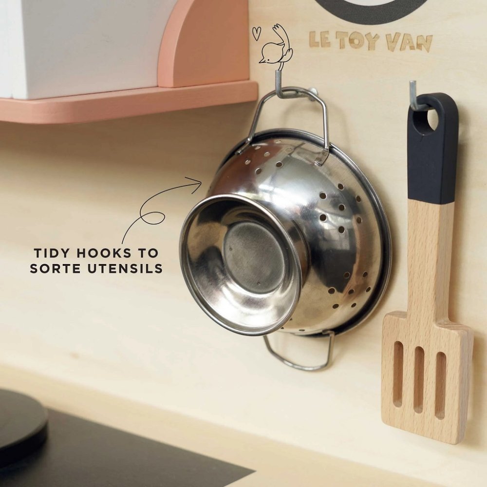 Főzzön mennyei ételeket ezzel a retro stílusú, fából készült álomkonyhával. Tele van interaktív funkciókkal, amelyek órákig tartó, valósághű szerepjátékot tesznek lehetővé. Fedezze fel a mosogatót, a sütőt, a mosógépet, az elforgatható csapokat és a működő sütőórákat. Ráadásul van mikrohullámú sütő, óra és rengeteg tárolóhely. A konyha FSC® tanúsítvánnyal rendelkező fából (fenntartható módon kezelt erdőkből származó fa) készült, és gyermekek számára biztonságos, vízbázisú festékekkel van díszítve. A finom pasztellszíneket a természetes kivitelezéssel, a szép nyomtatott csempékkel és a rattan részletekkel kombináló dizájnnak köszönhetően nagyszerű kiegészítője minden szobának! Játékok céllalA Le Toy Van cég összes játéka azzal a céllal készül, hogy sokáig kitartson. Szeretettel tervezték tapasztalt kézművesek etikus gyakorlatok és fenntartható anyagok felhasználásával, amelyek kíméletesebbek bolygónkhoz. Főbb jellemzők: etikusan, FSC-tanúsítvánnyal rendelkező, fenntartható fából készültvízbázisú, nem toxikus festékekkel festvea legszigorúbb szabványok szerint tesztelvetartalmazza a konyhát, a szűrőt, a konyharuhát, a mikrohullámú sütőt, a sót és a borsotötletes játékra ösztönöz Az FSC® (Forest Stewardship Council) védjegy és tanúsítvány garantálja, hogy a fa, amelyből a termék készült, nem illegális kitermelésből származik, hanem olyan erdőkből, amelyeket fenntartható vagy természetközeli módon művelnek, szigorú környezetvédelmi és társadalmi követelmények betartásával. Az FSC® védjegy a terméken azt jelenti, hogy vásárlásával segít megvédeni az erdőket, és támogatja a fenntartható, felelős vagy természetközeli gazdálkodást, amelynek köszönhetően erdeink stabilabbak, egészségesebbek, természetes fajösszetételűek és jobban ellenállnak az éghajlatváltozás negatív hatásainak.