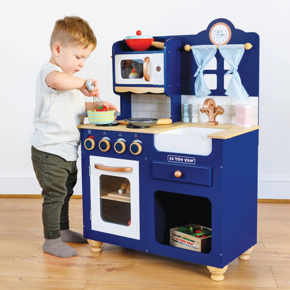 Az Oxford konyha erős és fenntartható fából készült, eredeti kialakítása pedig egyedi darabbá teszi. Királykék árnyalatúra van festve, részletei rézszínűek. Ez a hagyományos játék minden gyerekszobába illik, és a gyerekeket szerepjátékra ösztönzi. Funkciói közé tartozik a nyitható sütőajtó, a forgatható gombok, a mosogató, a mikrohullámú sütő, az aranyos függönyös ablak és a forgatható mutatókkal ellátott óra. A csomag tartalmaz egy habverőt, egy fakanalat, egy sótartót és egy borsszórót is. Minden a kis szakácsoknak. A konyha kiegészíthető a Honeybake kollekció ételeivel és kiegészítőivel a Le Toy Van-tól. Gyönyörű játék, amely generációról generációra örökíthető. Játékok céllalA Le Toy Van cég összes játéka azzal a céllal készül, hogy sokáig kitartson. Szeretettel tervezték tapasztalt kézművesek etikus gyakorlatok és fenntartható anyagok felhasználásával, amelyek kíméletesebbek bolygónkhoz. Főbb jellemzők: fa konyha kiegészítőkkeletikusan, fenntartható fából készülta legszigorúbb szabványok szerint tesztelvevízbázisú, nem toxikus festékekkel festvekreatív és ötletes játékra ösztönözsegíti a beszéd és a szociális készségek fejlesztéséttámogatja a korai fejlődést Honeybake kollekció: A kollekció játékai alkalmasak a felfedezésre, segítik a gyermekek képzelőerejének, szociális és verbális készségeinek, valamint kognitív funkcióinak fejlesztését. A hagyományos design a modern részletekkel biztosan le fogja kötni a gyerekeket. A Honeybake a Le Toy Van kollekciója, amely a legtöbb díjat nyerte el, a design, a minőség, a biztonság, valamint az oktatási és játékérték terén.