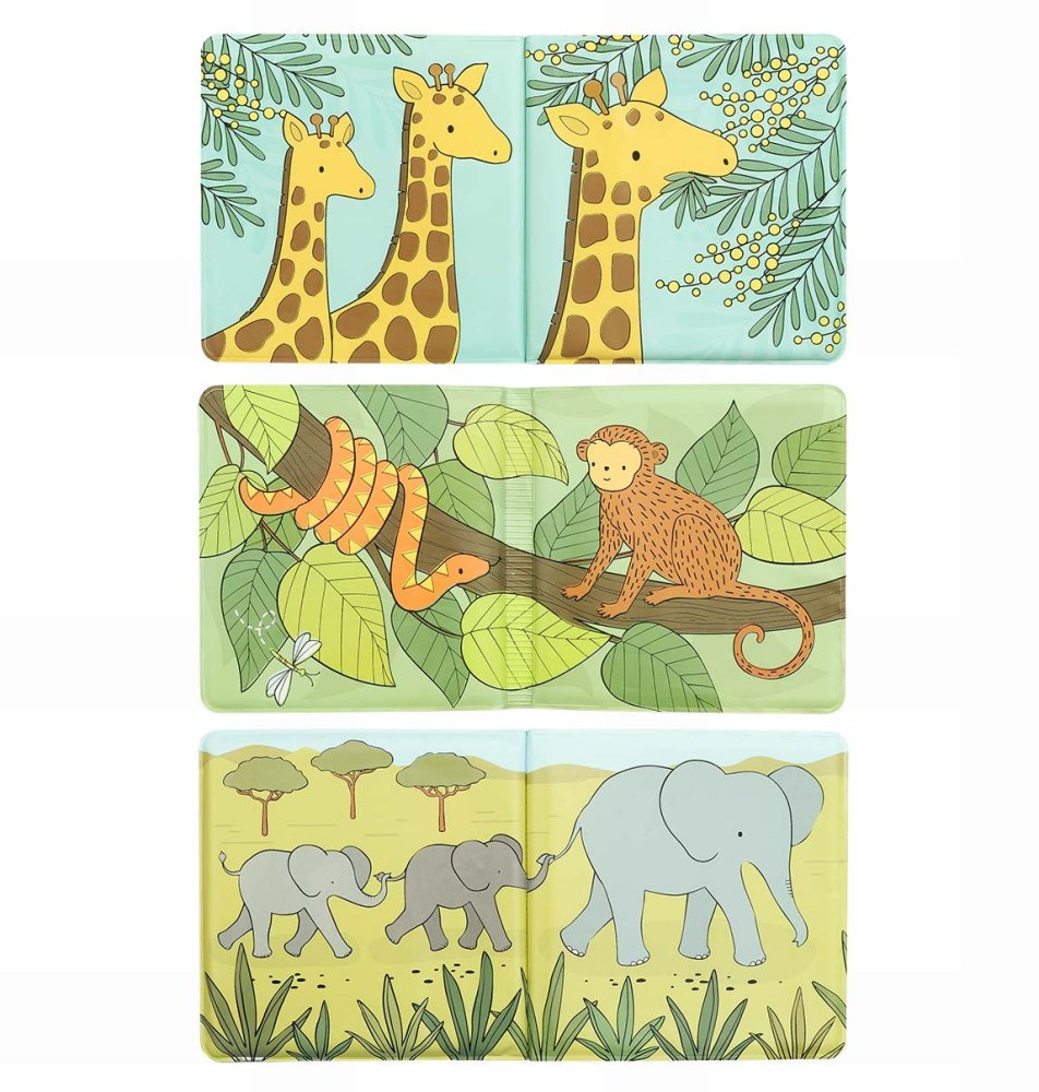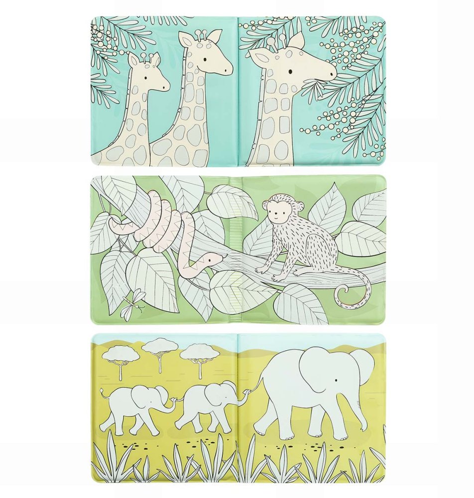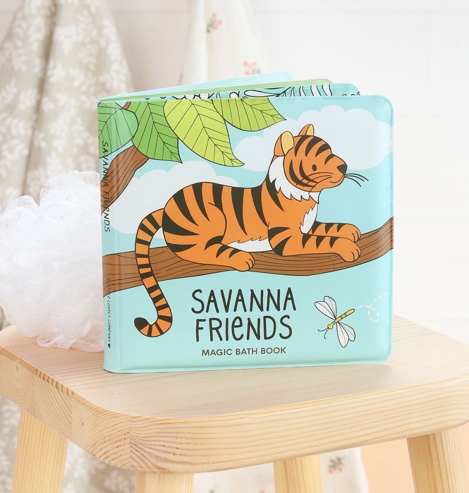 Varázskönyv az esti fürdetés felpezsdítésére 12 hónapos kortól. A puha oldalak vízállóak, és tele vannak aranyos szavannai állatokkal. A fürdőkönyv színei kiemelkednek, amikor vízzel érintkeznek. A varázskönyv vizes ecsettel a kádon kívül is színezhető. Száradás után a színek eltűnnek. A könyv mérete 16 x 16 cm.