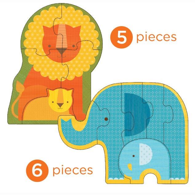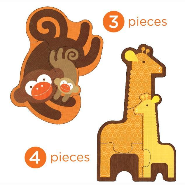 Puzzle, amely együtt nőhet gyermekével, négy különböző nehézségi fokú kirakót tartalmaz. Praktikus, újrahasznosított kartondobozba csomagolva, zsinór fogantyúval ellátva. Főbb jellemzők: 4 állatka, összesen 18 darab (3–6 darabos kirakó)praktikus csomagolás