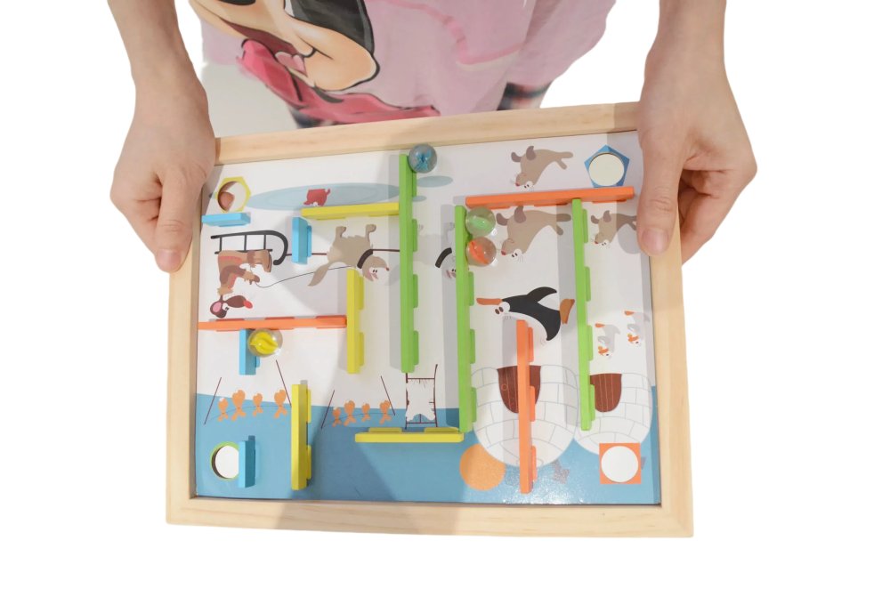 Szereted a fejtörőket és a rejtvényeket? Lenyűgöznek a különböző labirintusok? Akkor ez a kreatív billenő labirintus a megfelelő számodra. Helyezd a fa akadályokat a megfelelő lyukakba a táblán a színek szerint, vagy hozz létre saját pályát, és kezdődhet a játék. Helyezd a golyókat tetszőleges helyre, és a játékfelület döntésével próbáld meg a kijelölt lyukakba helyezni őket. Vagy elérheted a kitűzött célt azáltal, hogy a golyókat egyesével a lyukakba pöckölöd. Főbb jellemzők: 22 darabot tartalmaz fejleszti a finommotorikát és a kézügyességet javítja a kézügyességet és a koncentrációt