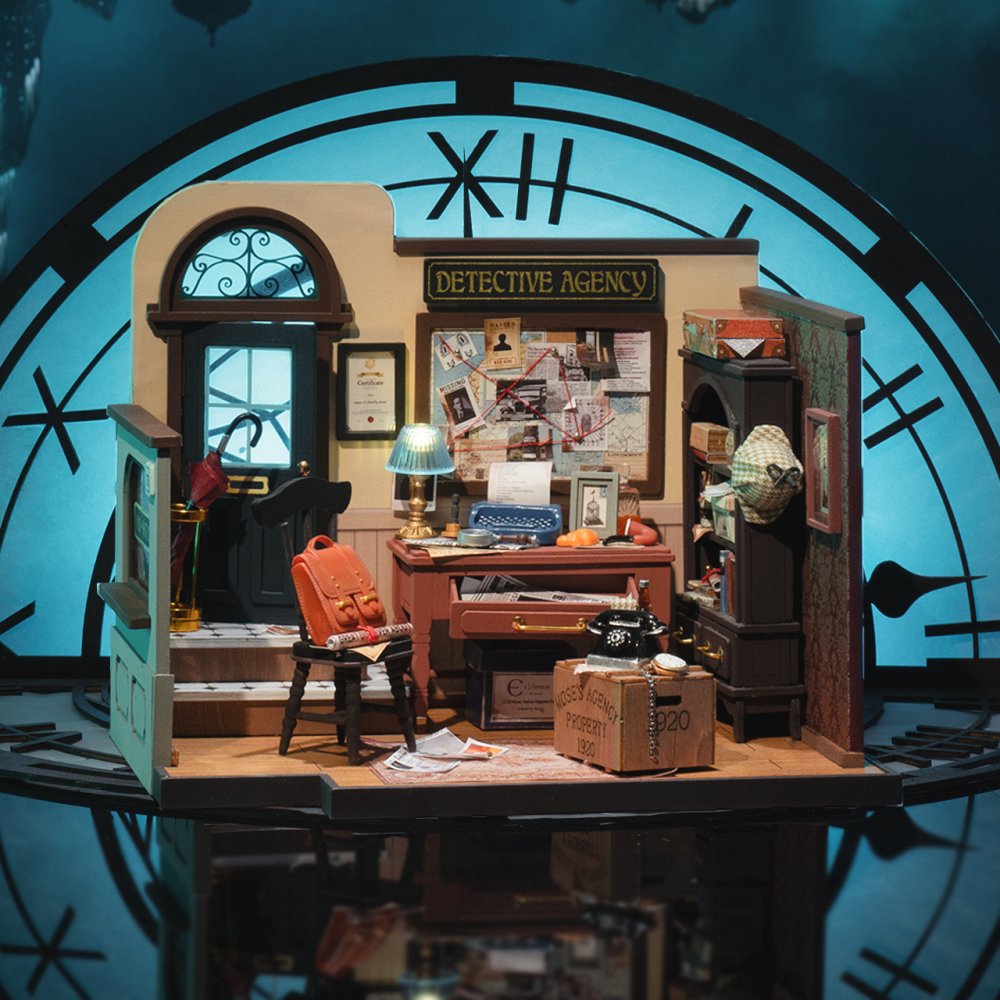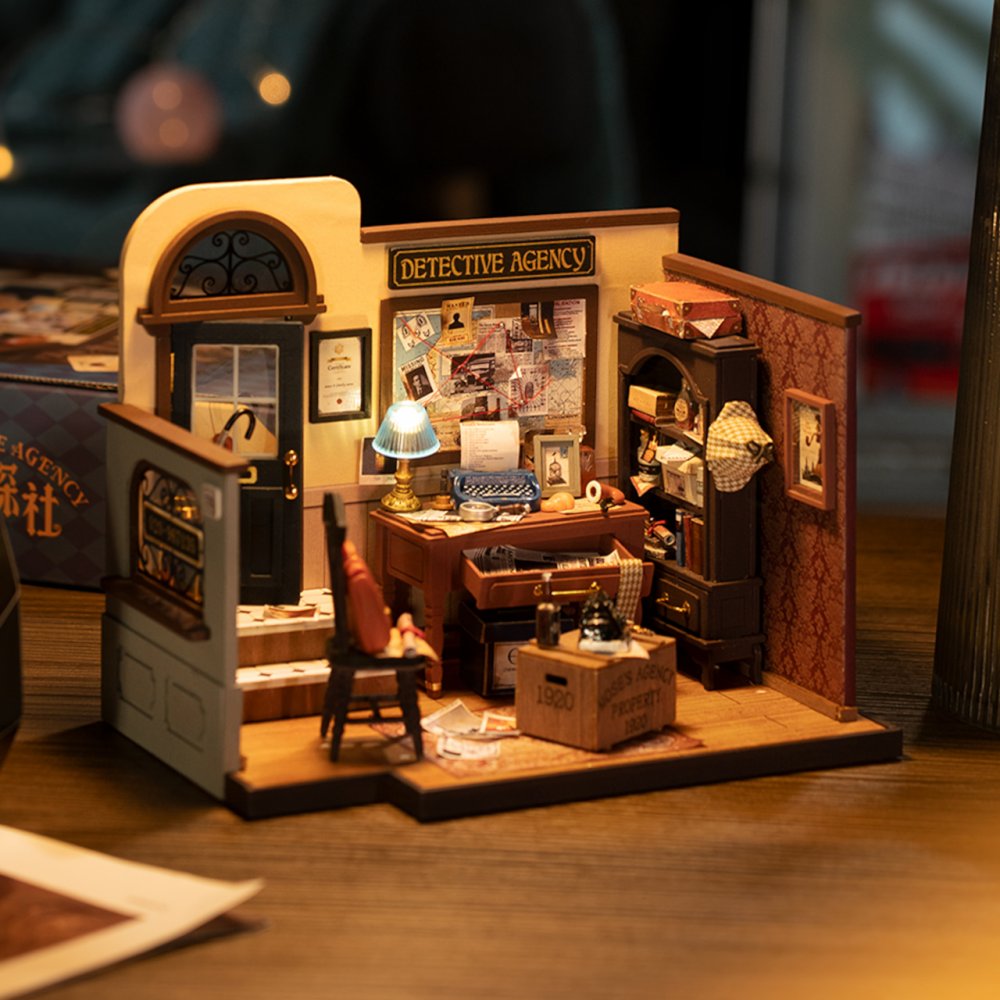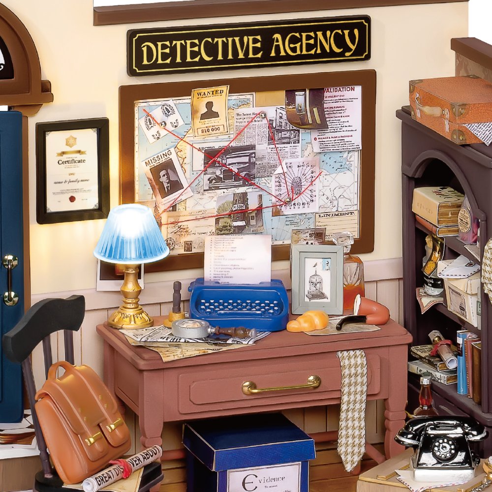 Tekintsen be egy tapasztalt nyomozó irodájába, aki éppen egy rejtélyes tolvaj nyomában van! Fedezze fel a Robotime részletes miniatűrjeinek világát, amelyek egyedi művészi építőkészletek formájában érkeznek. Az összeszerelésükkel kellemes pillanatokat tölthet el, és az eredménnyel megszépítheti szobája zugait. Szinte minden készlet LED-es világítással van felszerelve, amely a kész modell színeivel együtt meghitt légkört varázsol. A művészeti készletek több különböző sorozatra vannak osztva, és kivételesen változatos kínálatot alkotnak. Közelebb áll Önhöz a lakótér, a vállalkozás vagy valami más? Könnyen választhat! Minden építőkészlet szétszerelt állapotban kerül szállításra. Az építés főként a rétegelt lemezből készült, már kivágott alkatrészek festését és ragasztását, karton vagy szövet elemek és papírnyomatok elkészítését foglalja magában. A csomagban az összes alkatrésszel és részletes útmutatóval együtt ragasztót, festékeket, ecsetet és egyéb eszközöket talál. A kényelmes világítás beépítéséhez javasoljuk, hogy készítsen elő félgömbölyű fogót. Általában az összeszereléshez és a módosításokhoz elegendő egy közönséges olló, amelyet biztosan mindig megtalál otthon. Főbb jellemzők:tartalmazza az építőkészlet alkatrészeit, ragasztót, festékeket, ecsetet stb.a becsült összeszerelési idő 10 óraLED világítás (2×AAA elem nem tartozék)az építéshez saját olló szükséges, és egyéb apró szerszámok használatát is igényelheti