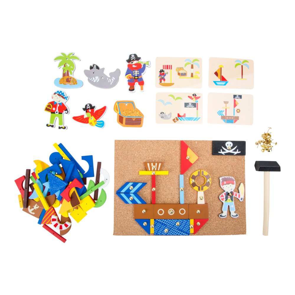Klasszikus kalapálós játék gazdag választékkal, kis fa elemekkel, kalóz témával, praktikus fa kalapáccsal együtt. A csomag tartalmaz négy kétoldalas, mintatervekkel ellátott kártyát. Arany színű rajzszögekkel szállítjuk, amelyek könnyen rögzíthetők a rugalmas parafához. Lehetővé teszi egyedi dombornyomott képek létrehozását. A praktikus tárolódoboznak köszönhetően semmi sem vész el. Főbb jellemzők: fejleszti a kreativitást és a koncentrációtfejleszti a finommotorikátpraktikus tárolódoboz