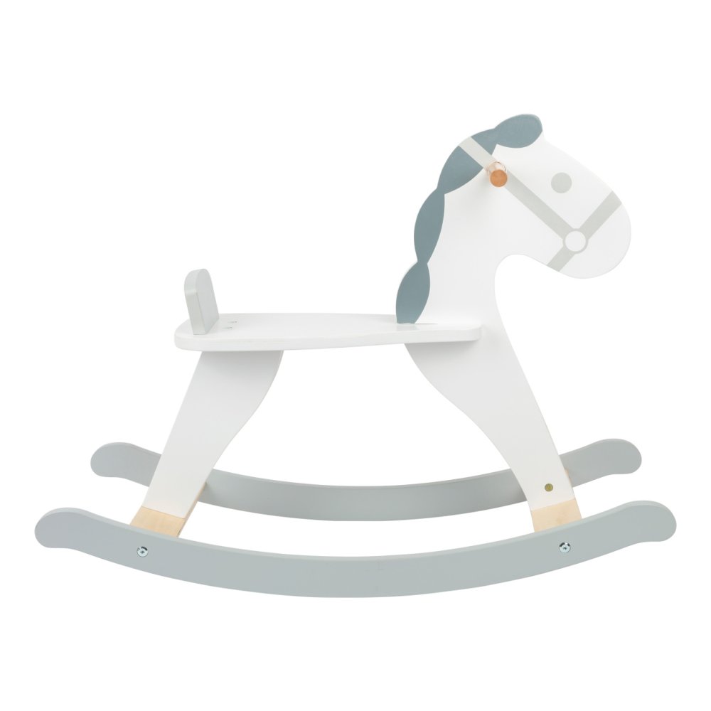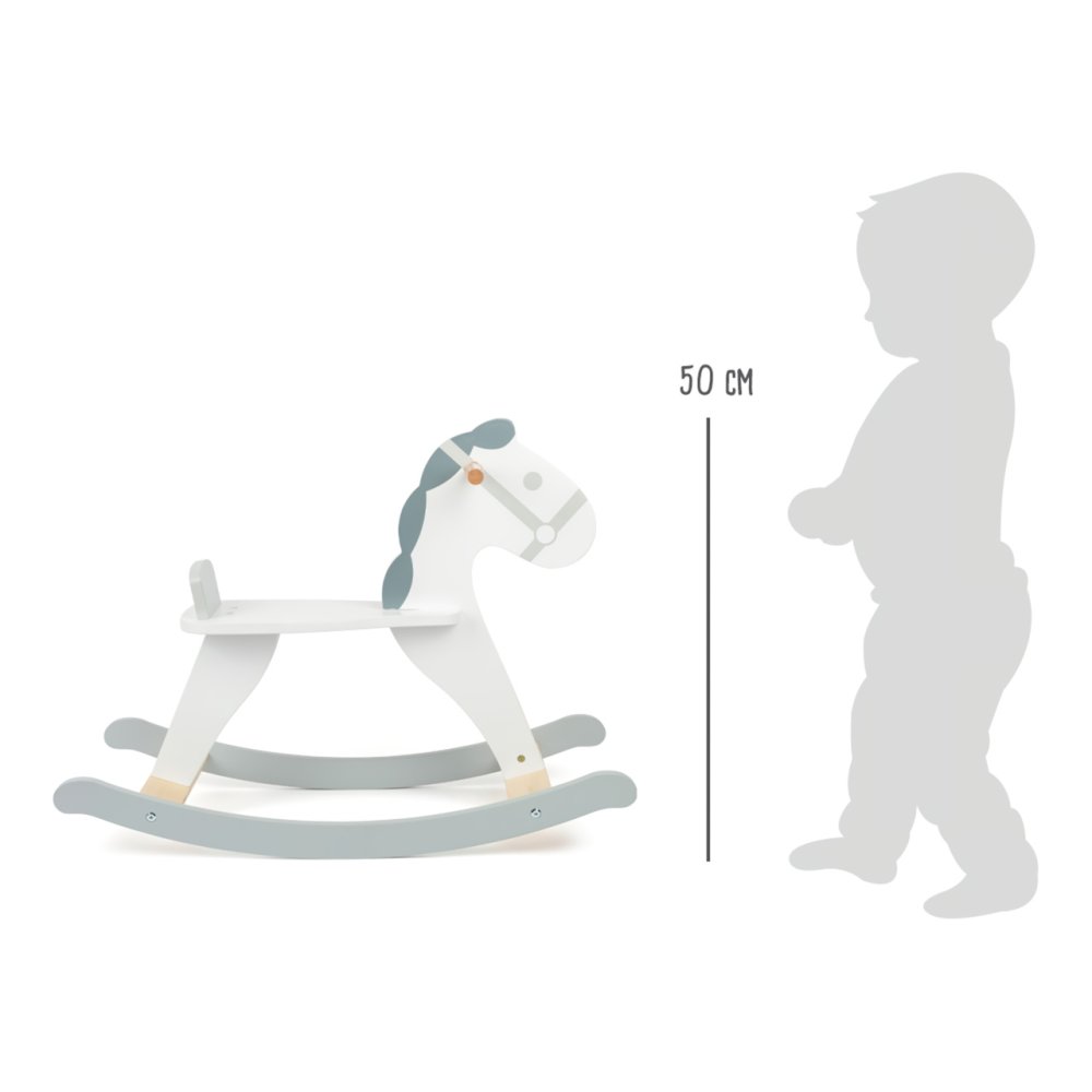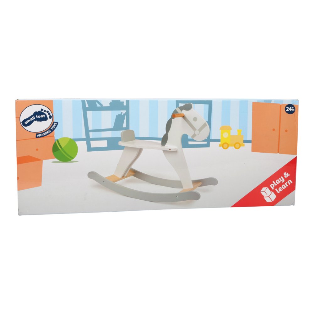 Klasszikus játék, amely nem hiányozhat egyetlen gyerekszobából sem. A barátságos formák ringatózó utazásokra csábítják a gyerekeket, amelyekkel erősíthetik és tökéletesíthetik mozgáskoordinációjukat vagy egyensúlyérzéküket. A nagyobb biztonság és a biztos ülés érdekében a lovacska ülése szilárd háttámlával van ellátva. A minimalista, skandináv stílusú, fehér és szürke színeket kombináló dizájnnak köszönhetően ízlésesen kiegészíti a modern belső teret. A vastag rétegelt lemezből és tömör fából készült szerkezet hosszan tartó szórakozást biztosít. A termék szerelést igényel, összeszerelési képes útmutatóval kerül szállításra. Főbb jellemzők: modern designülés háttámlávaltartós fa kivitel