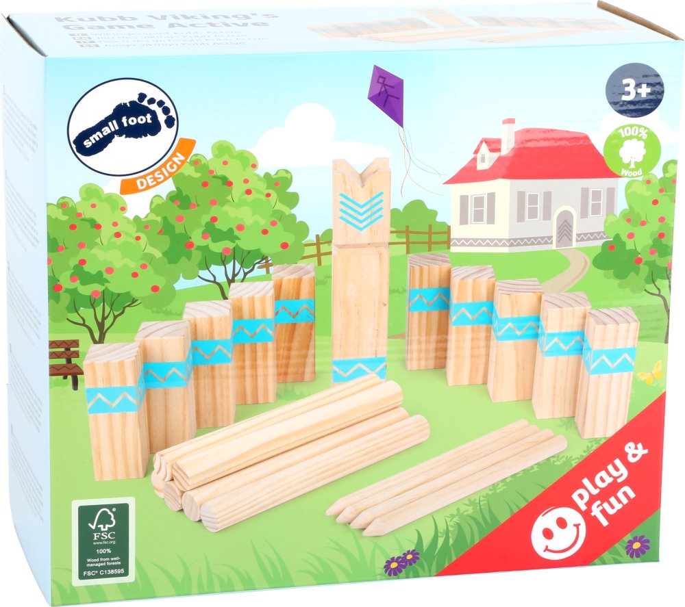 Aktív szórakozás! Ez az izgalmas ügyességi játék 100%-ban tanúsított FSC® fából készült. Fiatalabb és idősebb játékosok számára is alkalmas, hiszen ez egy precíziós játék. Gyönyörű a designja, ez a kültéri játék mindenki figyelmét felkelti, akár a kertben, akár a strandon. A kis rudakkal jelölje ki a játékteret, a nagyobb rudakkal pedig dobálja, és próbálja meg ledönteni a kék jelölésű hasábokat. A pálya méretét Ön állíthatja be aszerint, hogy milyen nehézségi fok felel meg Önnek. Ki tudja legyőzni a viking királyt?A csomag tartalma: 1x király, 10x kubb, 6x kerek dobófa, 4x kis fa a játéktér kijelöléséhez. 2-12 játékos részére 5 éves kortól ajánlott. Főbb jellemzők: Fejleszti a gyermekek mozgáskoordinációját 100% FSC fából készült Az FSC® (Forest Stewardship Council) védjegy és tanúsítvány garantálja, hogy a fa, amelyből a termék készült, nem illegális kitermelésből származik, hanem olyan erdőkből, amelyeket fenntartható vagy természetközeli módon művelnek, szigorú környezetvédelmi és társadalmi követelmények betartásával. Az FSC® védjegy a terméken azt jelenti, hogy vásárlásával segít megvédeni az erdőket, és támogatja a fenntartható, felelős vagy természetközeli gazdálkodást, amelynek köszönhetően erdeink stabilabbak, egészségesebbek, természetes fajösszetételűek és jobban ellenállnak az éghajlatváltozás negatív hatásainak.