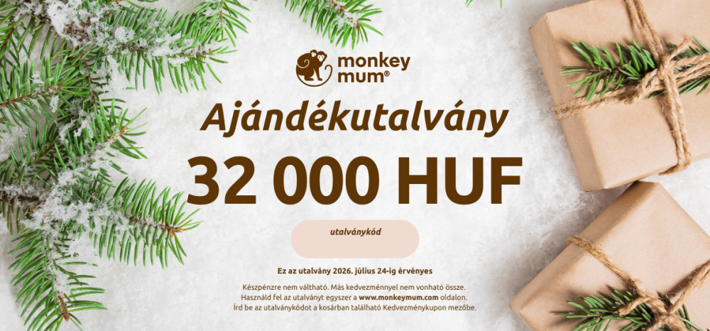 Az ajándékutalvány egyszer használható fel a www.monkeymum.com weboldalon egy adott értékű vagy nagyobb összegű vásárlásra. Az utalvány készpénzre nem váltható be.