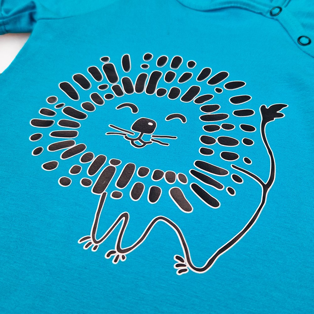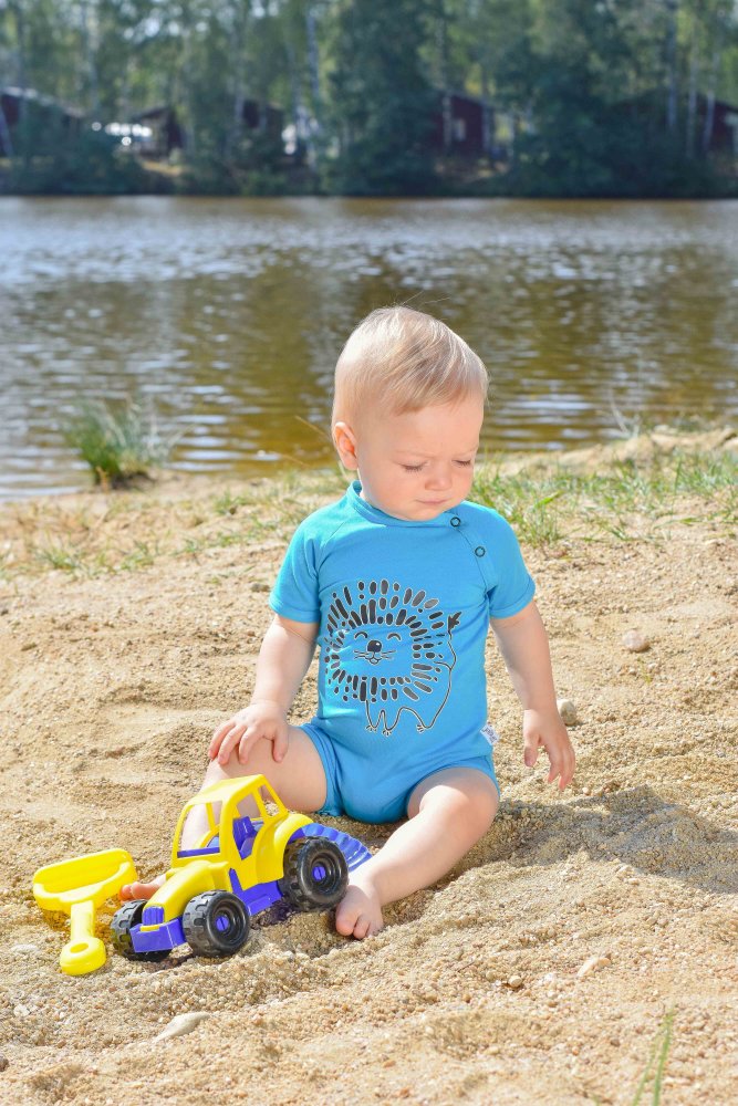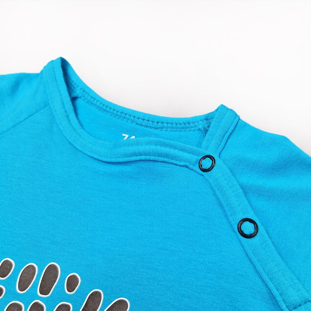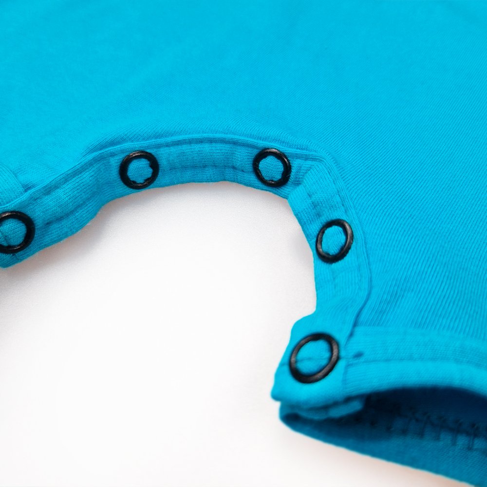Az anyag rugalmasságának köszönhetően az overall szépen illeszkedik a testre, és sehol sem áll el. Patentokkal záródik, amelyek az egyik oldalon a nyaknál és a lábak között helyezkednek el a könnyű pelenkázás érdekében.